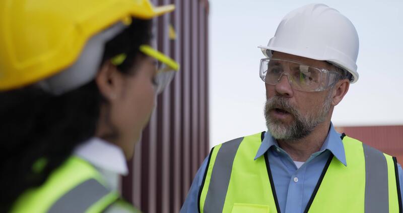 Pretty engineer female working on laptop computer, middle-aged Caucasian business manager man come in and blame the delay to loading Container in Shipping Port, logistics transportation concept. Pro Video