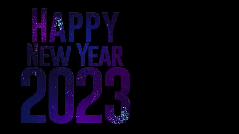 New Year 2023 greeting card. Group of blue, purple, magenta and white colored fireworks exploding inside letters against black background with copy space. Loop sequence. 3D animation Pro Video