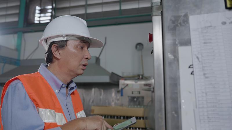 Machine or maintenance engineers inspect machines and sterilizers in factories or manufacturing industries and write down the information on tablet. Boiler, retort, appearance check, function test. Pro Video