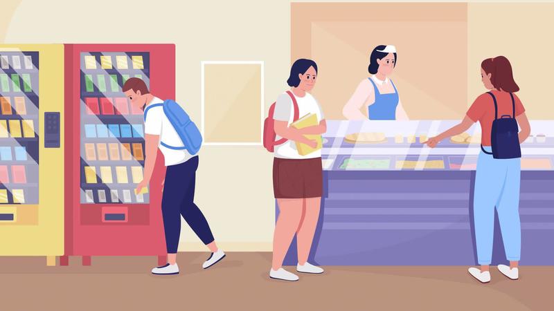 Animated high school cafeteria. Food service. Lunch program. Students. Looped flat color 2D cartoon characters animation with vending machine, counter on background. HD video with alpha channel Pro Video