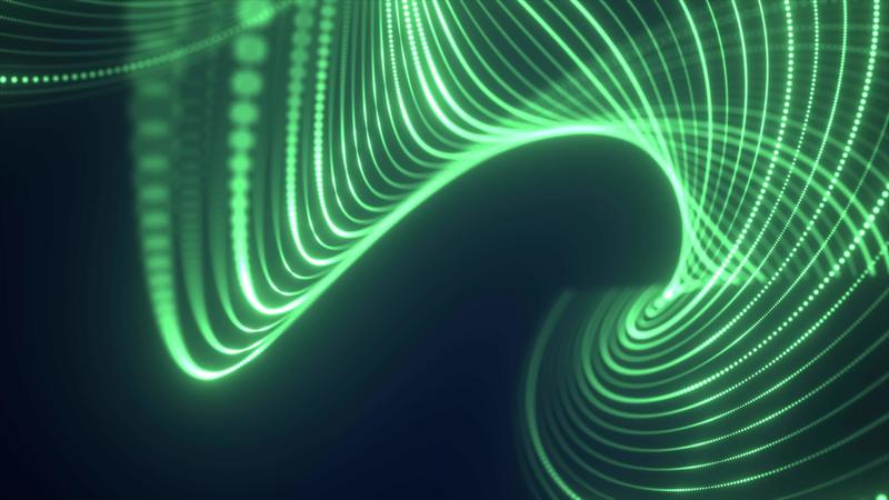 Abstract green waves from lines and dots particles of glowing swirling futuristic hi-tech with blur effect on dark background. Abstract background. Video in high quality 4k, motion design Pro Video