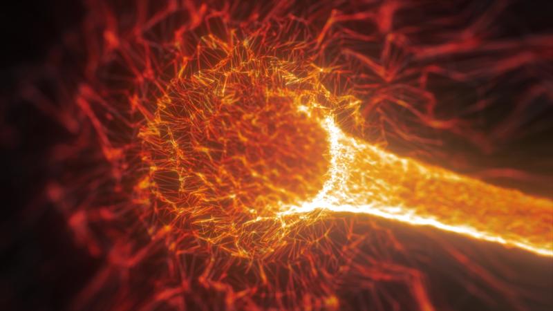 Abstract orange tunnel swirling from lines and particles of triangles glowing futuristic hi-tech with a blur effect on a dark background. Abstract background. Video in high quality 4k, motion design Pro Video