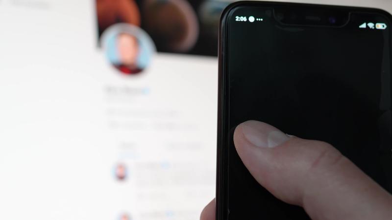 Kyiv, Ukraine - November 21, 2022 User uninstalling social media Twitter from a smartphone against the backdrop of the monitor with an open profile of Elon Musk. Removing digital app due to addiction