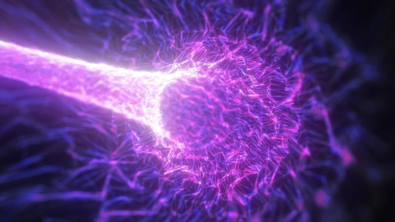 Abstract purple tunnel swirling from lines and particles of triangles glowing futuristic hi-tech with a blur effect on a dark background. Abstract background. Video in high quality 4k, motion design Pro Video