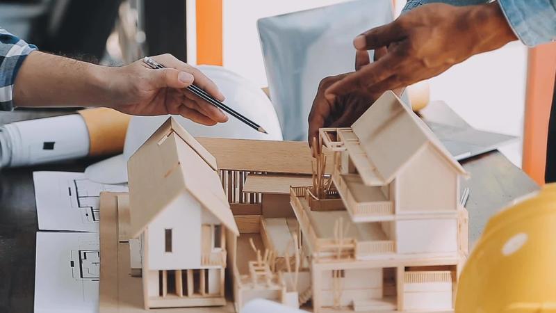 Construction and structure concept of Engineer or architect meeting for project working with partner and engineering tools on model building and blueprint in working site, contract for both companies. Free Video