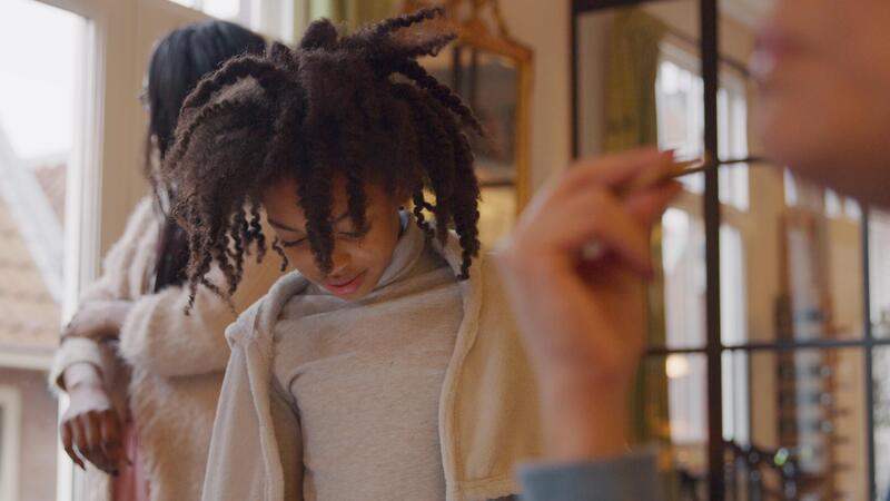 Girl looks down on table, talks, woman on background, touches head of girl, girl looks up and down again. Woman in front eats. Pro Video
