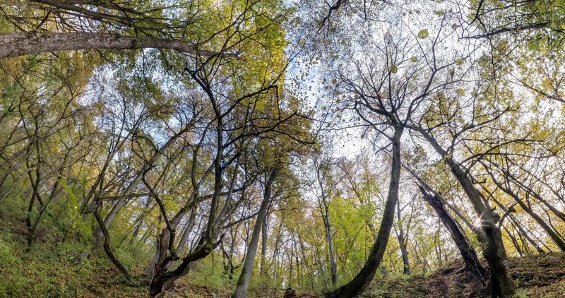 spinning and torsion and underneath tall forest with clumsy branches. Trees growing in the sky with loop rotate Pro Video