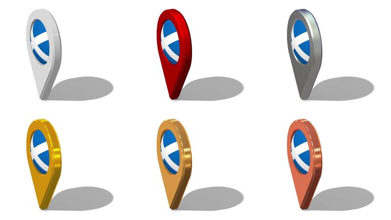 Scotland Flag 3D Location Icon Seamless Looping Rotation in Different Color, 3D Rendering, Looped Animation, Chroma key, Luma Matte Selection Free Video