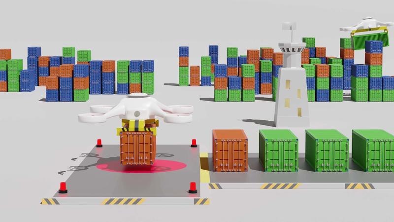 delivery drone and shipping container with conveyor for import export, air traffic, logistic service of the future concept, 3d animation Pro Video