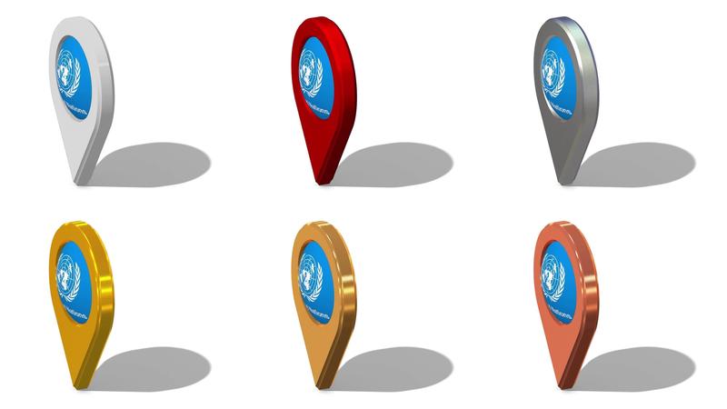 United Nations Flag 3D Location Icon Seamless Looping Rotation in Different Color, 3D Rendering, Looped Animation, Chroma key, Luma Matte Selection