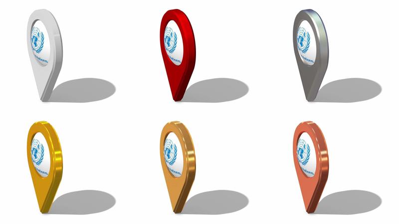 United Nations Flag 3D Location Icon Seamless Looping Rotation in Different Color, 3D Rendering, Looped Animation, Chroma key, Luma Matte Selection