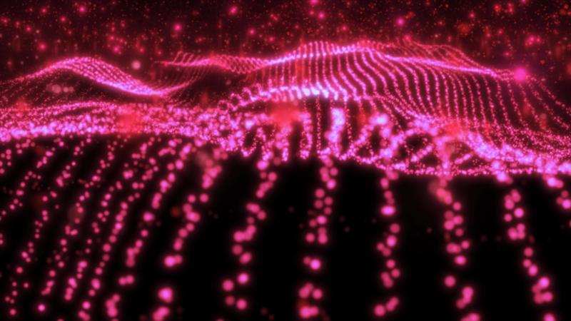 Abstract red wave lines from particles and energy magical dots with glow effect and blur bokeh abstract background. Video 4k, 60 fps Pro Video