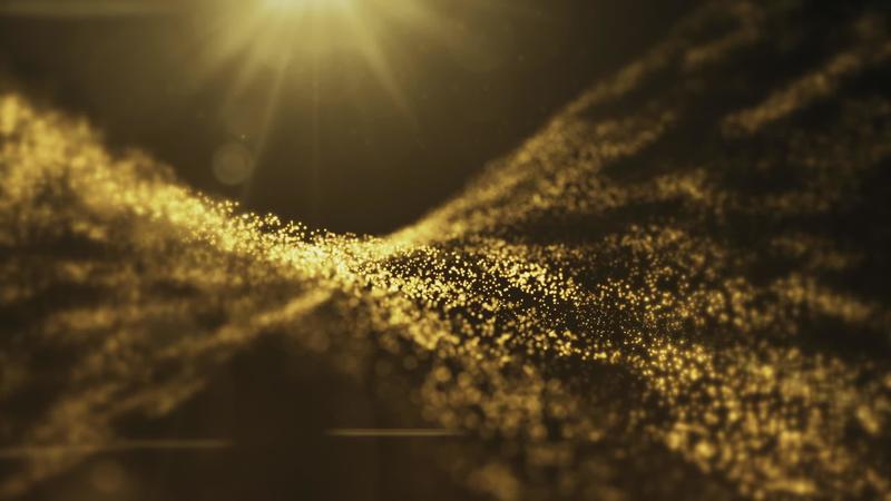 Abstract motion background animation with a flowing golden fractal wave of glittering gold light particles and lens flare. Depth of field bokeh. Pro Video