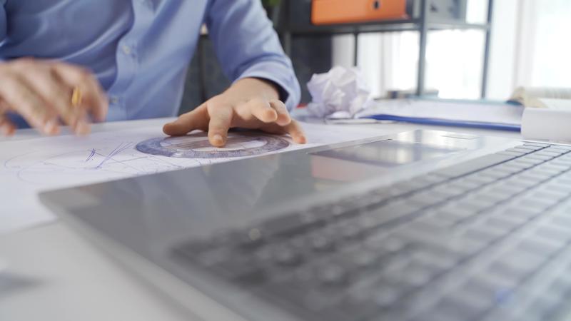 Architect workflow. Project, design drawing. Architect designer drawing plan blueprint close-up. Professional engineer working, interior creator making architectural house project, drafting building. Pro Video