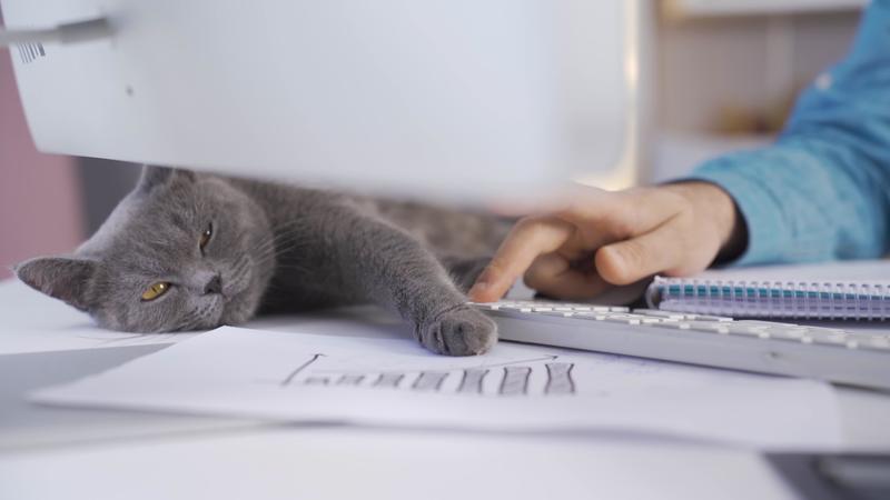 Lazy gray cat sleeping on the table in the office. Cat sleeping at the desk of the owner working in the office. Pro Video