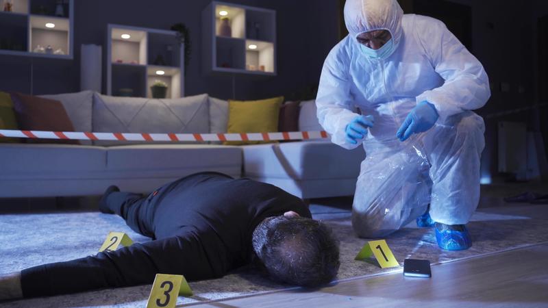 Gathering forensic evidence at the crime scene. Forensic expert. A forensic expert in a protective suit examines empty shell casings at the crime scene. Pro Video