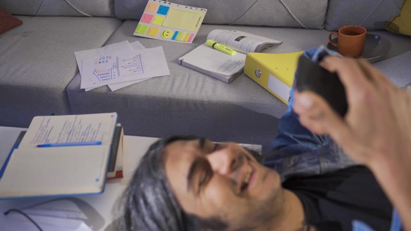 Lazy man looking at phone at home and smiling. Lazy businessman looking at phone and not caring about what he has to do. Pro Video