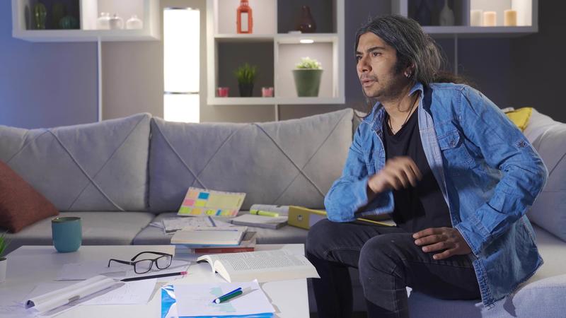 Lazy businessman having trouble working at home gets bored. Lazy businessman is sitting on sofa and reluctant instead of working at home. Pro Video