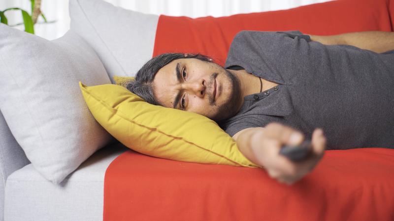 Bored lazy man watching tv. The bored man who can't find a TV channel to watch is lying on the sofa. Pro Video