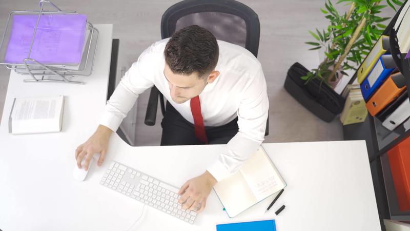 Businessman is using computer at his desk in the office. Businessman working in office using computer and looking at camera with smile. Pro Video