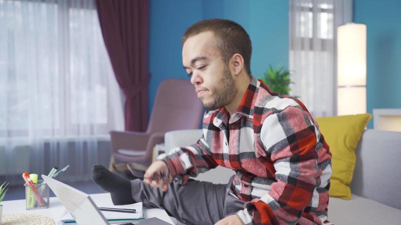 Smart and happy disabled dwarf young man working from home online at computer. Happy and cheerful smart dwarf man working from home at computer, coming up with new genius and creative ideas. Pro Video