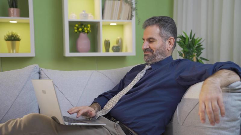 Man using laptop on sofa relaxing at home. Mature man relaxing at home lying on sofa, using laptop, typing using keyboard. Pro Video