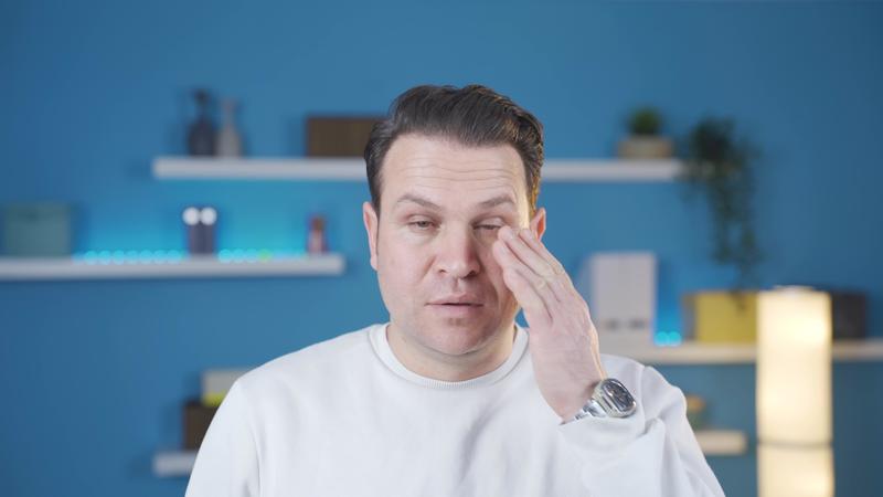Man with sore eyes from lack of sleep, having trouble seeing and opening his eyes. The man who is sleepy at home cannot open his eyes because of fatigue and weakness, he cannot see well. Pro Video