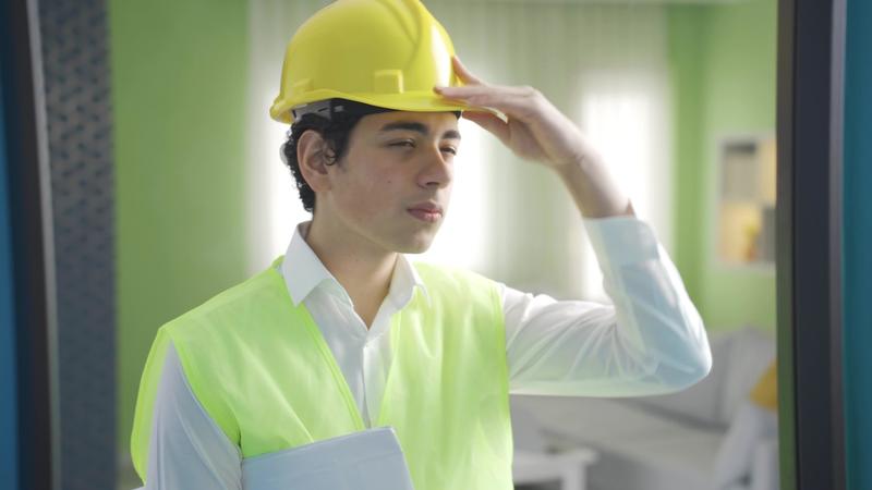 The boy in a helmet and vest dreams of being an engineer in front of the mirror. Cute boy looking at himself in front of the mirror dressed as an engineer at home. Future Engineer. Pro Video