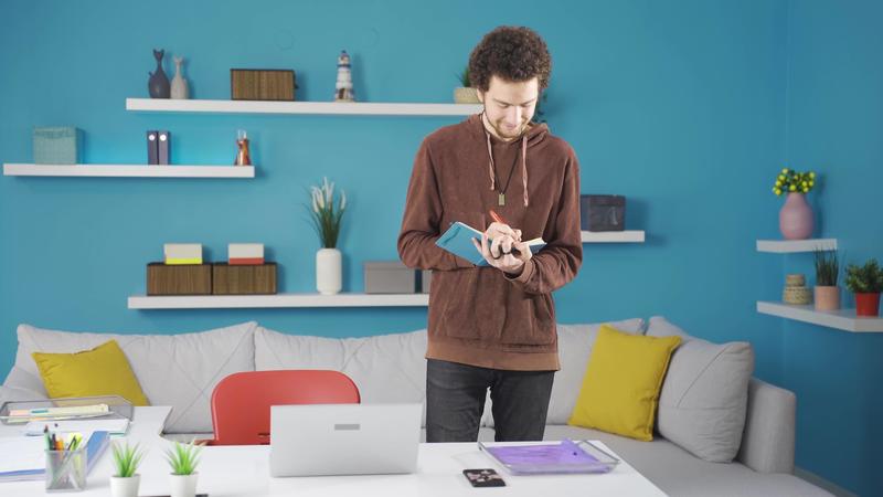 Energetic university student is doing her homework while dancing. Happy young male student dancing and looking at laptop while taking notes in notebook with high mood. Pro Video