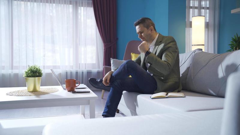 The stressed and angry stock trader is losing and its value is falling. Stressed trader watching stock market on laptop at home. Bitcoins, futures, investment market. Pro Video