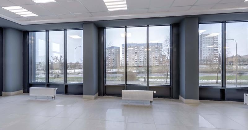 loop rotation and panoramic view in empty modern hall with columns, doors and panoramic windows overlooking the city. Pro Video
