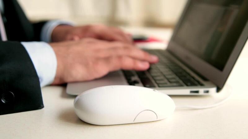 Businessman work with laptop in office, typing keyboard, click mouse, search data, selective focus, noise effect Free Video