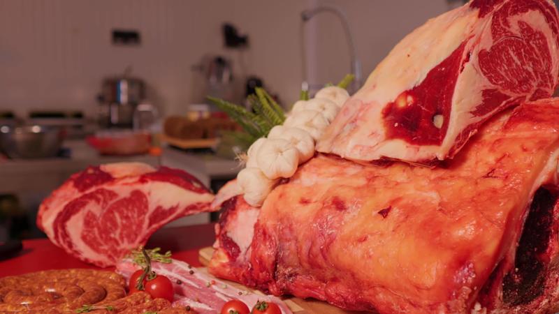 Appetizing meat products are on display on the table in butchery. Pro Video
