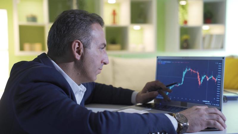 The broker monitors and considers stock sales statistics. Investment concept. Man Using Computer with Screen Displaying Real Time Stocks and Currency Market Charts. Pro Video
