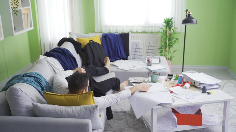 Lazy and messy man running late. Messy lazy man falling asleep on sofa at home being late for work. Pro Video