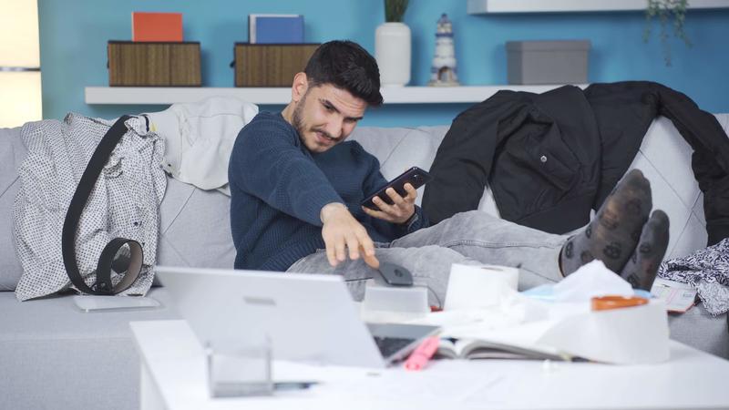 Messy and lazy man is bored and overwhelmed at home. The man sitting at home has a lazy, messy, disorganized lifestyle. Pro Video