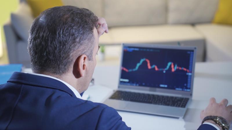 The stressed and angry stock trader is losing and its value is falling. Stressed trader at home watching stock market from laptop, losing, landing charts. Pro Video