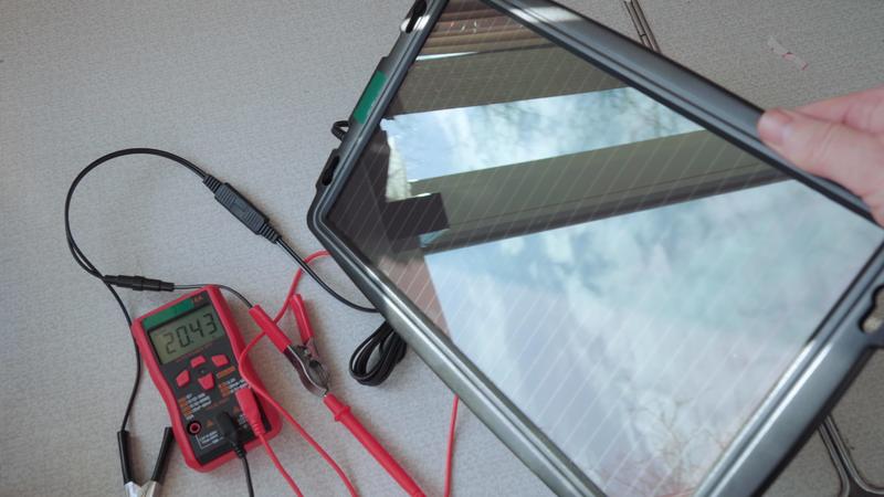 A small solar panel is connected to a tester to measure the output voltage. Free Video