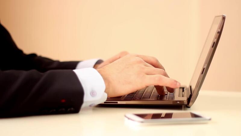 Businessman using tablet computer using keyboard typing fast, businessman sends message in office workplace, selective focus Free Video