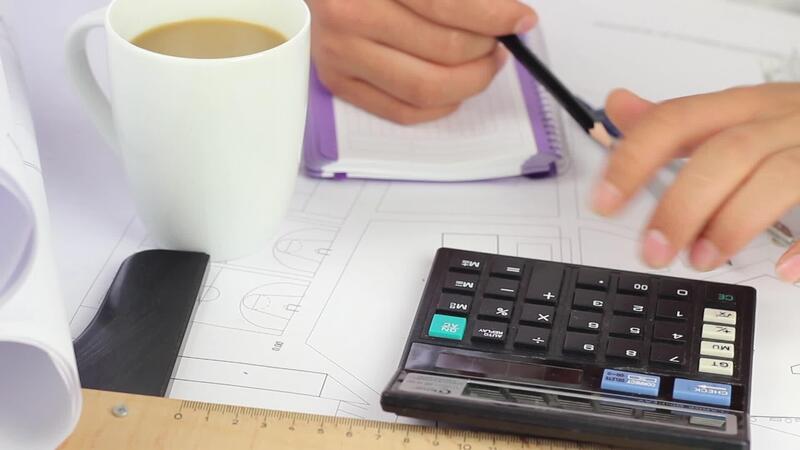 Architect making calculations for project with cup of coffee, businessman writing data from calculator to notebook, selective focus Free Video