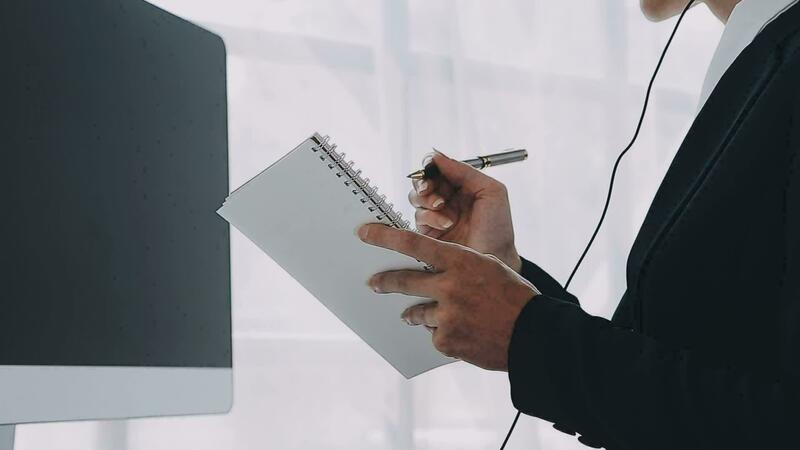 Call center agent with headset working on support hotline in modern office with copy space. Portrait of mature positive agent in conversation with customer over headset looking at camera. Free Video