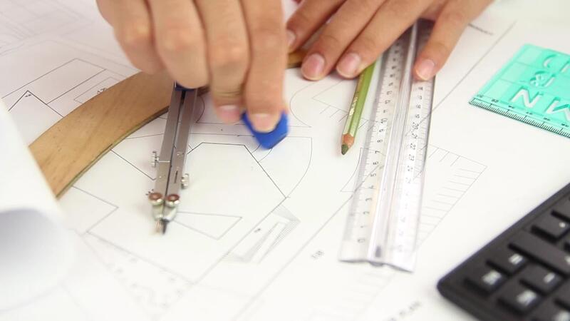 Architect man drawing with ruler and pencil erases wrong line, architect fix mistakes in blueprint with eraser, selective focus Free Video