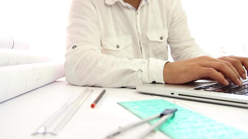 Architect sitting at desk research on laptop and developing project, man drawings on large format paper from internet, selective focus Free Video