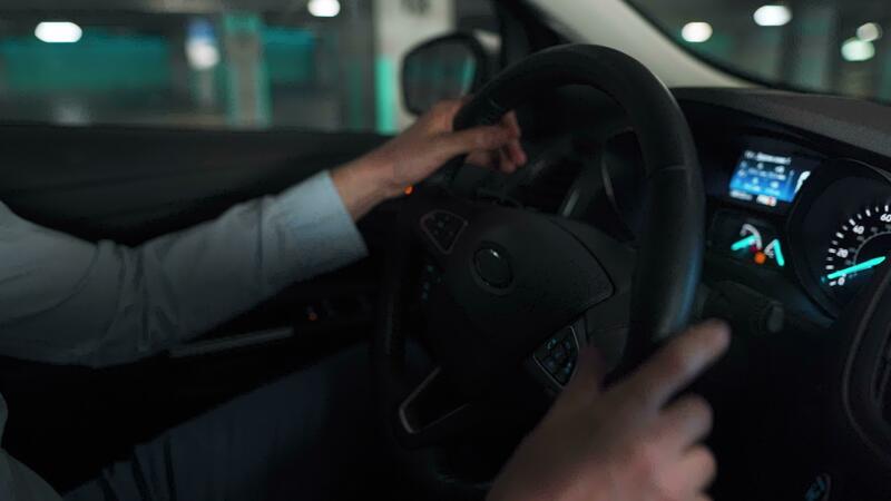 Man driving in innovative automated car using self-parking autopilot for parking on parking lot. Robotic computer turning wheel in auto steering mode Pro Video
