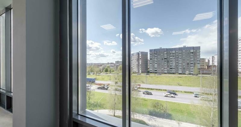 loop rotation and panoramic view in empty modern hall with columns, doors and panoramic windows overlooking the city. Pro Video