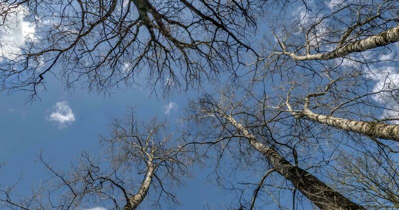 spinning and torsion and underneath tall forest with clumsy branches. Trees growing in the sky with loop rotate Pro Video