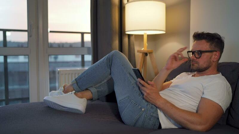 Man with glasses lying on the couch in a cozy room and using smartphone for surfing internet or chatting in messengers Pro Video