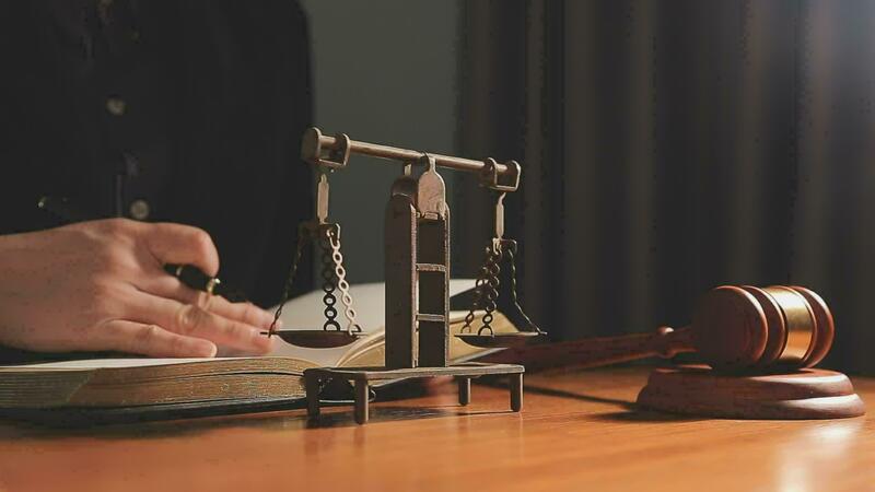 Justice and law concept.Male judge in a courtroom with the gavel, working with, computer and docking keyboard, eyeglasses, on table in morning light Pro Video