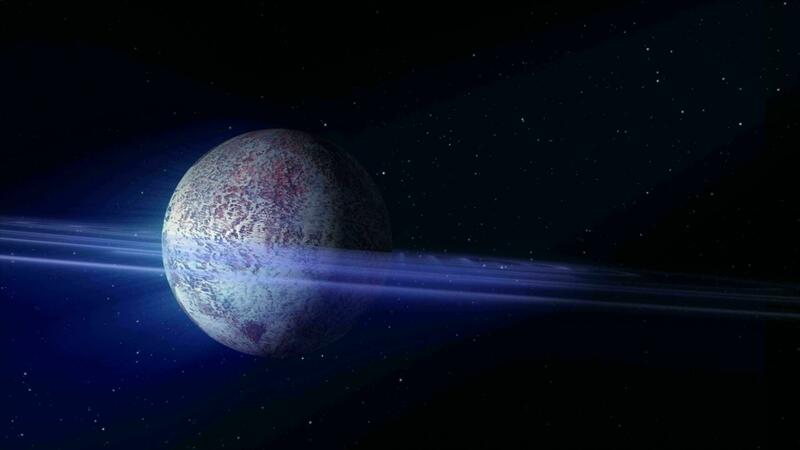 Abstract blue space planet with a round asteroid belt ring futuristic hi-tech on the background of stars in open space Pro Video
