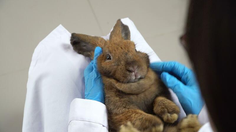 Veterinarian are carrying a rabbit on his lap and trying to open rabbit mouse and checking teeth Pro Video